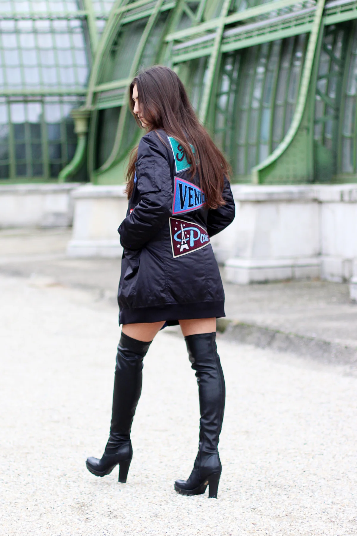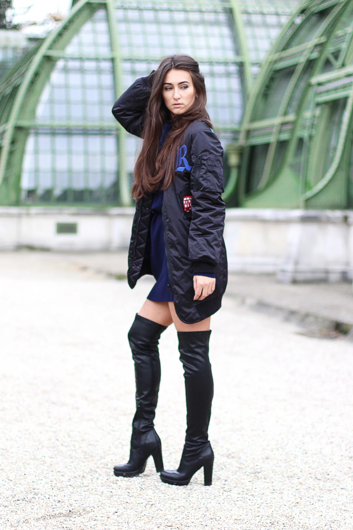 Zusätzlich zur Bomberjacke wollte ich meine Overknees wieder in Szene setzen und fand, dass sie zu diesem Look echt gut dazupassen. Diese Bilder sind vor einiger Zeit entstanden, bei dem Videodreh mit Fabs und Niki. Ich verlink Euch die beiden unten und Ihr müsst unbedingt bei denen vorbeischauen.