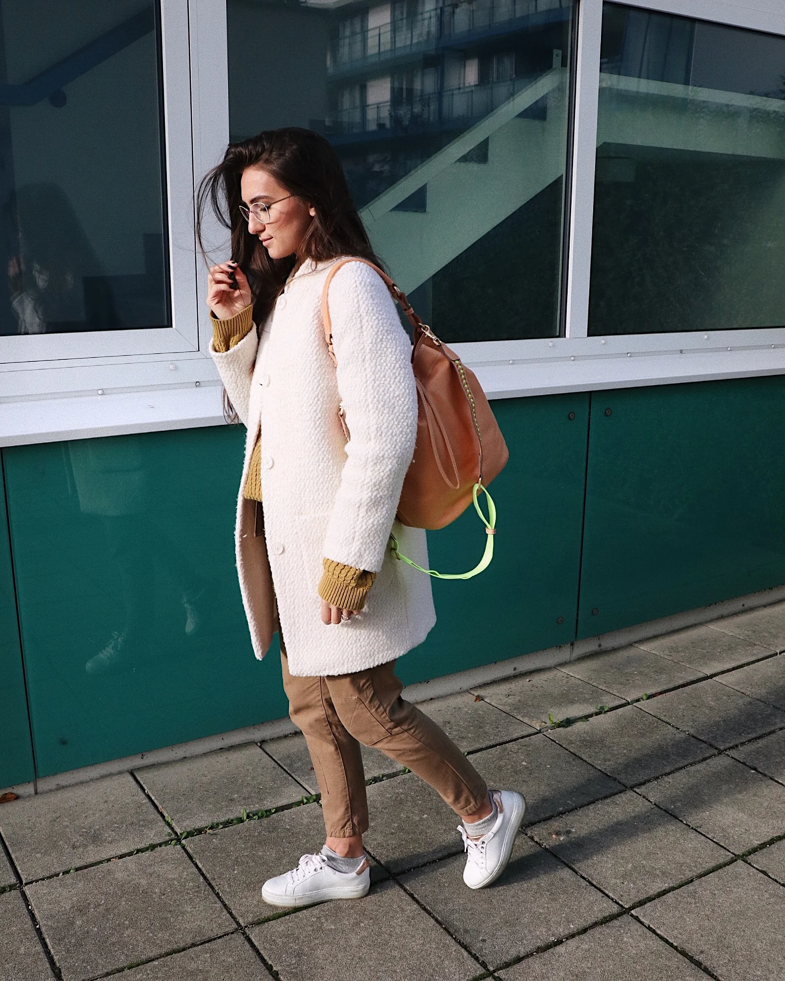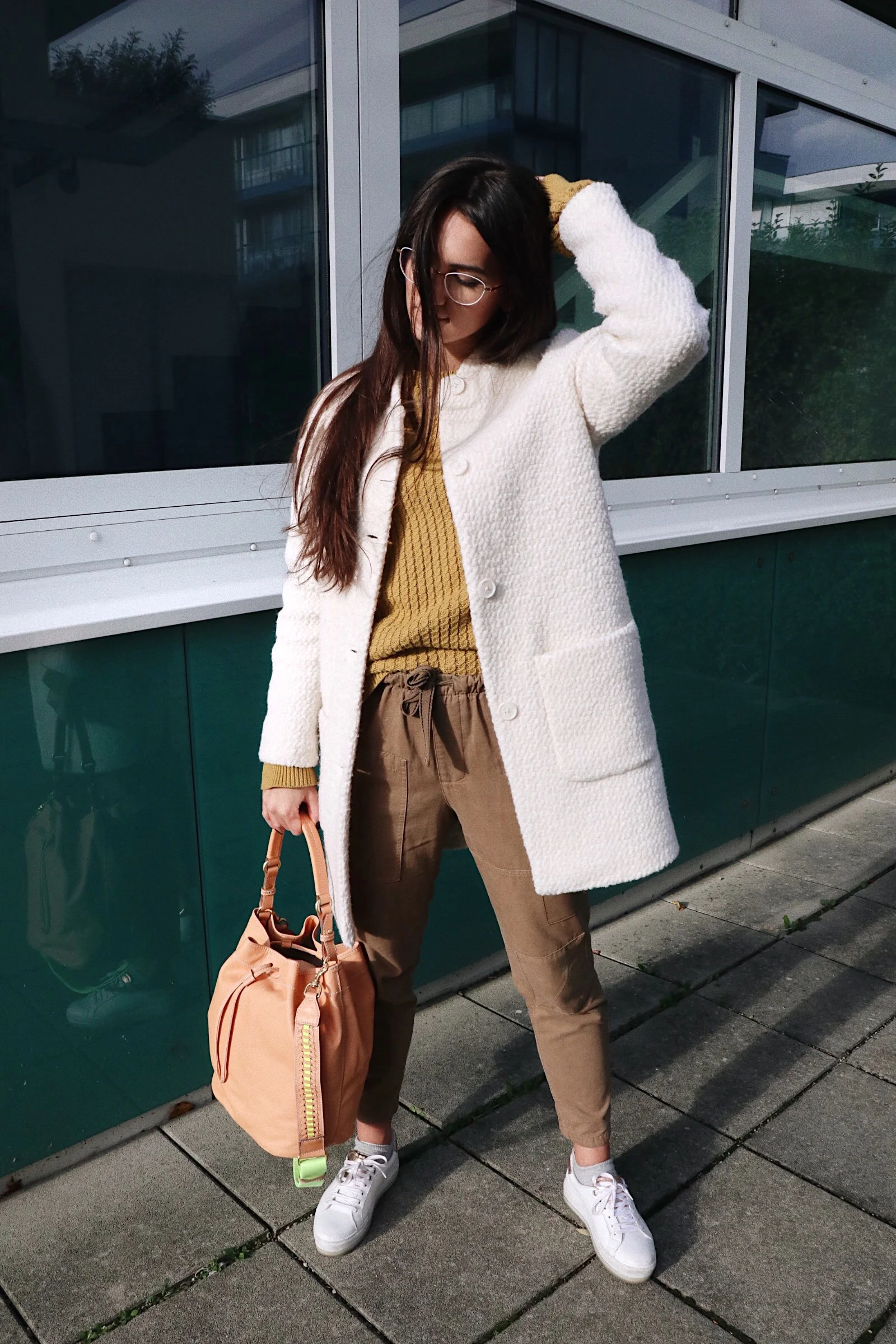Tja, nun auch ein paar Worte zum restlichen Look. Ihr wisst, wie sehr ich sportliche Looks liebe. Ich fühle mich darin wohl und kann alles problemlos machen. Es ist einfach bequem, sieht aber toll aus. Passend zur Tasche habe ich versucht meinen Look ein wenig farblich anzupassen. Natürlich hätte ich es mir auch sehr leicht machen und ein schwarzes Outfit auswählen können, aber ich wollte es ein bisschen anders haben. Ich muss auch ehrlich gestehen, dass ein kompletter Look in schwarz ziemlich gut aussieht. Wenn ihr dazu die Tasche in der Farbe nature kombiniert - ein Traum!! Dieser Look würde auf jeden Fall auch alle Blicke auf sich ziehen. So, nun zum Rest: der Pullover und der Mantel sind von Esprit und die Hose von Zara. Meine always must have Schuhe durften hier nicht fehlen und sind, wie ihr euch schon bestimmt denken könnt, von Diesel.
