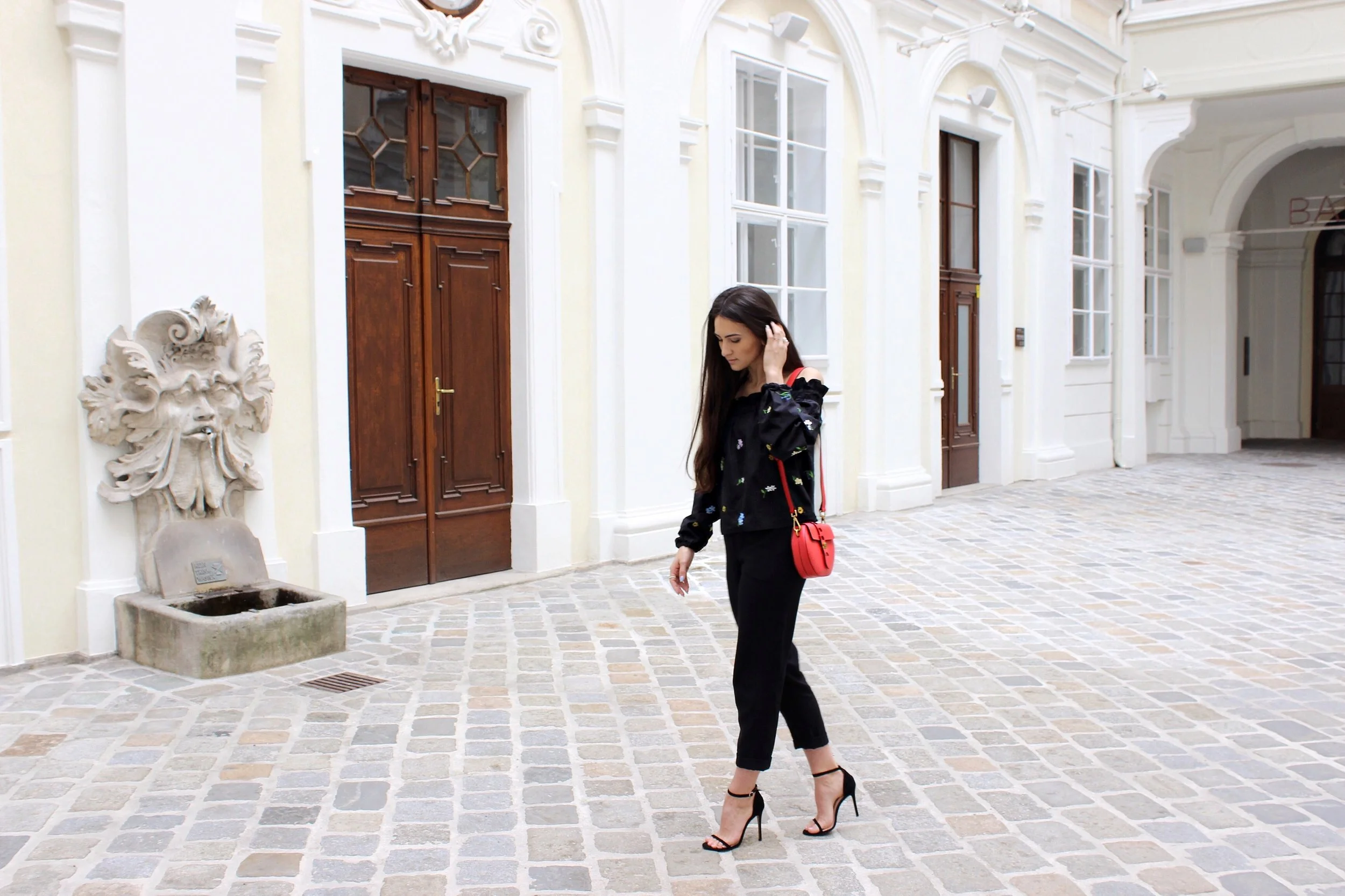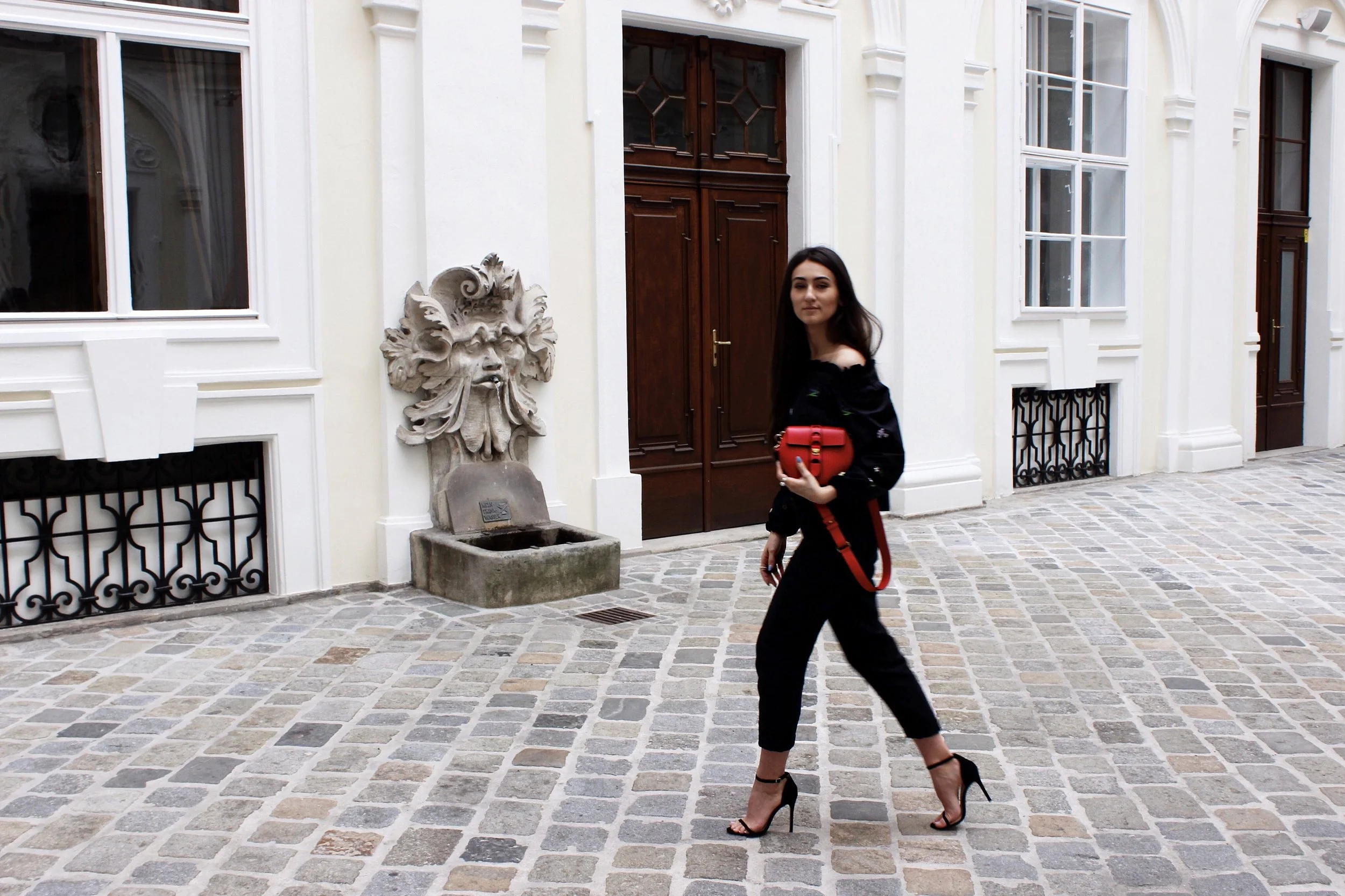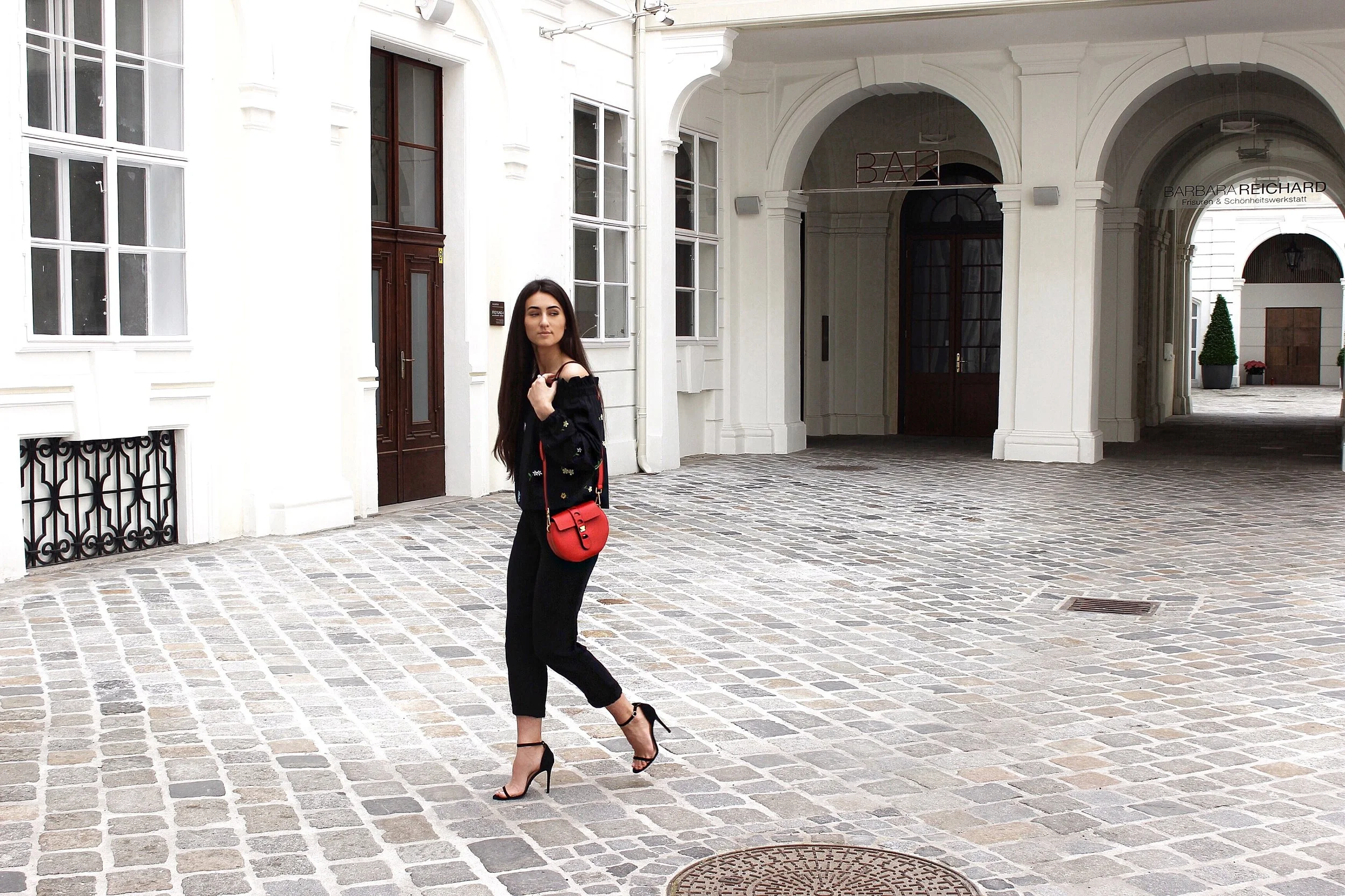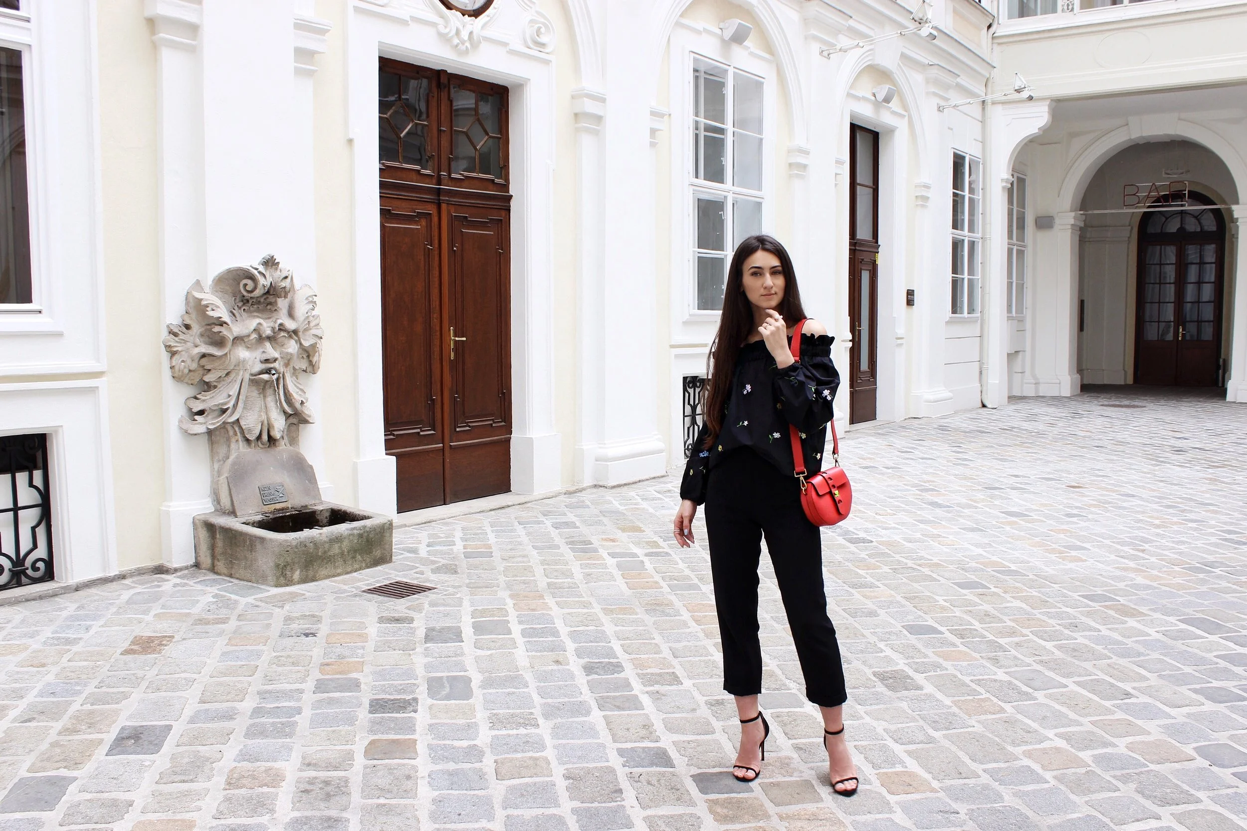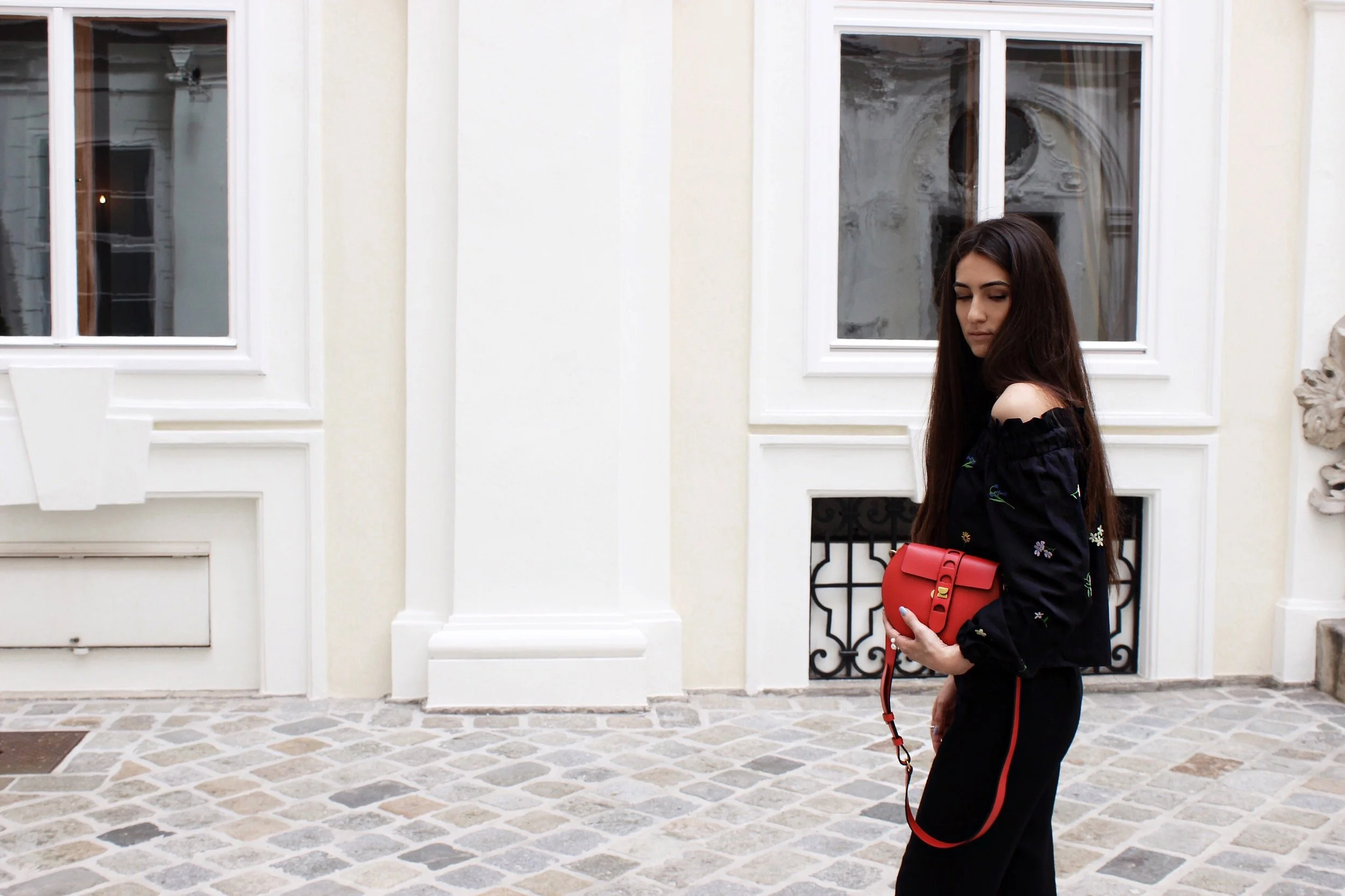 Zur Bluse habe ich jetzt eine einfache Stoffhose dazukombiniert, die oben bei der Taille sehr schön geschnitten ist. Also ich werde sie wahrscheinlich öfters anhaben, auch mit einem einfachen Top. Bin überzeugt, dass dies auch klasse aussehen wird. Zu den Schuhen kann ich nicht viel sagen, außer dass sie bequem und ein Klassiker sind. Ich habe viele schwarze Schuhe, aber leider nicht so einfache und daher mussten die auch in meinen Warenkorb landen. Und jetzt komme ich noch zu meinem letzten Lieblingsteil - nämlich der Tasche. Sie ist wunderschön, hat eine super Qualität und Verarbeitung. Größe und Farbe sind einfach ideal. Die Tasche ist einfach etwas ganz besonderes. Und.. wenn ihr euch diese Tasche bestellen solltet, dann bekommt ihr zum normalen roten Taschengurt noch einen etwas breiteren schwarz-weißen Taschengurt dazu. Also perfekt für den jetzigen Taschengurt-Trend :)